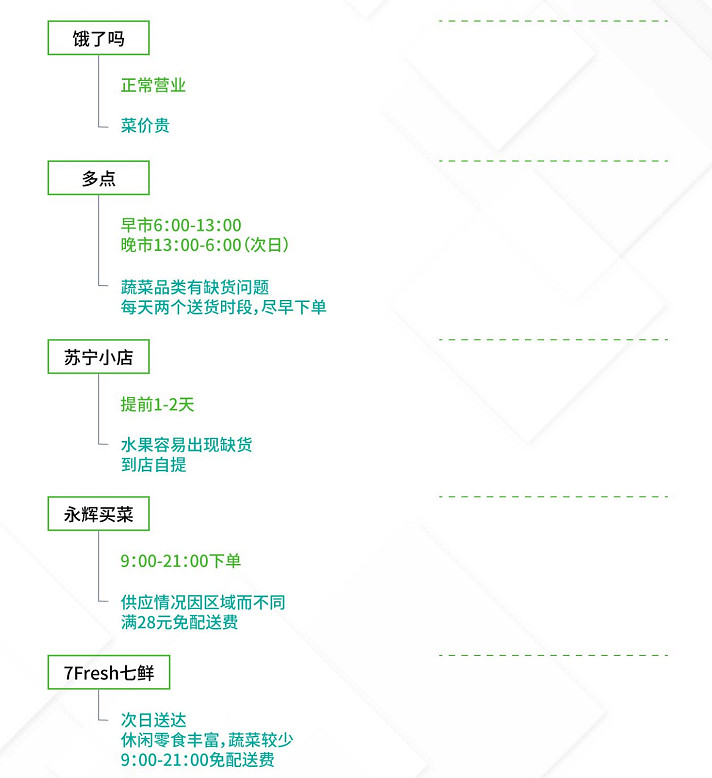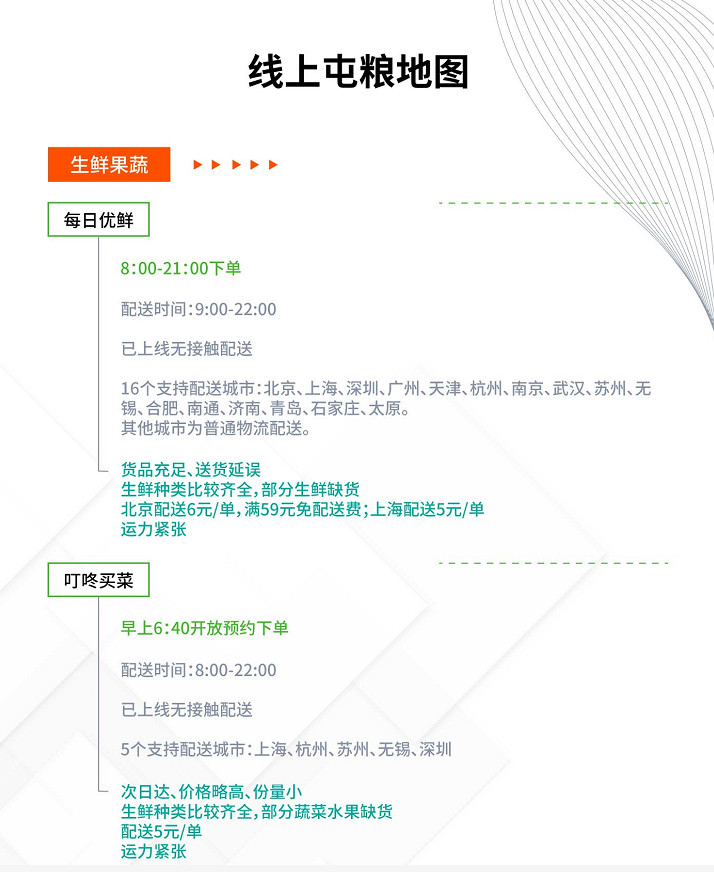 由于疫情,线下餐饮店现已很多封闭,往日热烈的大街冷清不少,不过大街上仍然有快递员、外卖员在奔走。线上购物的规模进一步扩展到菜市场和超市,很多人挑选在盒马鲜生、叮咚买菜、每日优鲜这样的渠道买菜,生鲜渠道订单火爆,蔬菜一上线就被抢空。